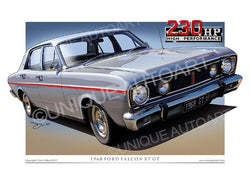 Introducing the classic 1969 XW GTHO Falcon art prints to our list of print designs. Each XW GT automotive design is printed on museum-grade 330gsm archival paper. The Epsom UltraChrome ink used on the Ford XW prints uses an aqueous (water-based) all pigment ink formulation, to produce an unsurpassed colour gamut that dries quickly to become water and scratch resistance and better UV resistance for enhanced image stability. This beautiful Falcon GT design was created by automotive illustrator Dion Mifsud.